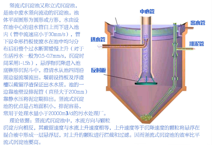 流式沉淀池是一種常用的沉淀池類型,其特點是水流方向與沉淀方向一致,從而提高了沉淀效果。豎流式沉淀池通常由池體、進水管、出水管、排泥管等部分組成。
